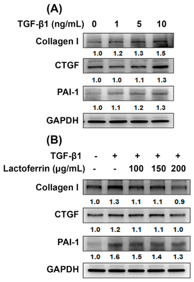 Lactoferrin inhibits TGF-β1-induced fibrosis in HK-2 cells. (A) TGF-β1 increases fibrosis-related protein, including collagen 1, CTGF and PAI-1. Cell were incubated with TGF-β1 for 24 h. (B) Effect of lactoferrin on fibrosis-related proteins expression in HK-2 cells exposed to TGF-β1 (10 ng/mL). Cells were pretreated with lactoferrin for 24 h and then incubated with TGF-β1 for 24 h.