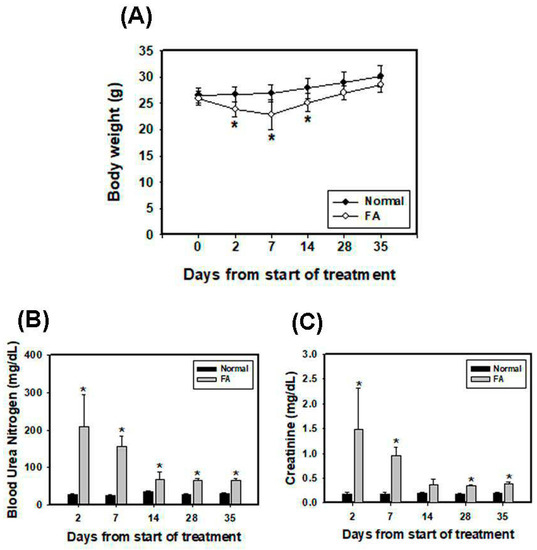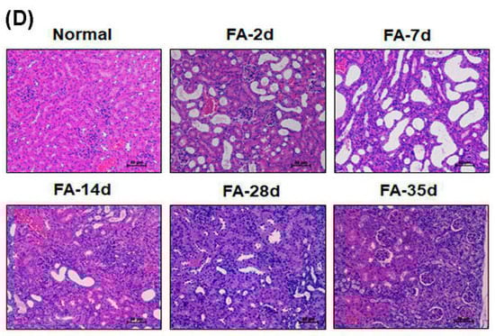 Ischemia/reperfusion (I/R), sepsis, toxicants and drugs are usual causes of AKI and induce tubular necrosis and reduce glomerular filtration [28]. Previous studies have demonstrated that high doses of folic acid (FA) cause AKI due to the formation of luminal crystals and toxicity in the tubular epithelium in rodents [29,30]. FA-induced AKI can cause CKD and fibrosis in a mouse model [31]. As shown in Figure 5A, mice given 250 mg/kg FA intraperitoneally had decreased body weight at days 2, 7 and 14 and recovered at days 28 and 35. BUN concentrations and serum creatinine levels predominantly increased after FA injection at days 2 and 7 and decreased until day 14 (Figure 5B,C). Renal histopathology was examined using H+E staining at days 2, 7, 14, 28 and 35 (Figure 5D). The results showed that the renal cortex after FA treatment displayed brush border loss and tubular dilatation at days 2 and 7. At day 14, there was a partial recovery of normal renal structure characterized by repopulation of the tubular epithelial cells, but brush border restoration showed that it was incomplete. FA caused marked glomerular atrophy, which is a hallmark of CKD, on day 35. Furthermore, renal fibrosis was assessed by Masson’s trichrome staining for collagen fibers (Figure S1). The results showed the significant accumulation of collagen fibers in the FA group at days 28 and 35. In summary, peak renal dysfunction, including serum creatinine and BUN, occurred 2 days after FA administration and gradually decreased at day 14. Although the two markers recovered, the persistent damage of normal tubular morphology was examined in kidneys until day 35, revealing incomplete recovery and early CKD progression.