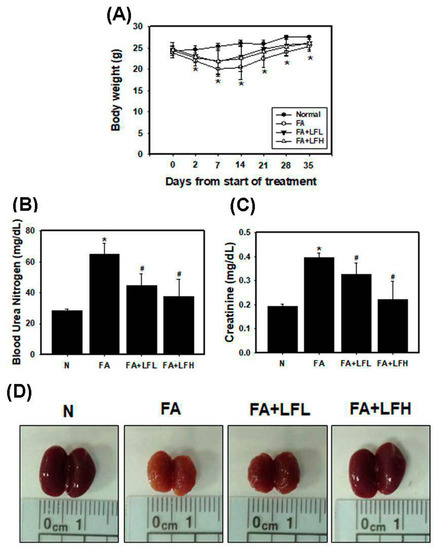 Renoprotective effects of lactoferrin on the FA mouse model. (A) Measurement of body weights of C57BL/6 mice. * p < 0.05 compared with FA. Renal function was assessed by measuring BUN (B) and creatinine (C) levels. * p < 0.05 compared with normal. * p < 0.05 compared with normal. # p < 0.05 compared with FA. (D) Direct observations of kidneys from the mice.