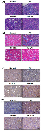 Male C57BL/6 mice (eight weeks old) were purchased from the National Laboratory Animal Center (Taipei, Taiwan). The animals were housed five per cage with 50% ± 10% relative humidity at 24 ± 2 °C. The animals were acclimatized for 1 week prior to the start of experiments and fed a Purina chow diet with water ad libitum. The animal protocol was reviewed and approved by the Institutional Animal Care and Use Committee of Taipei Medical University, Taiwan (approval number: LAC-2018-0362). All animal experiments took place at Laboratory Animal Center of Taipei Medical University. The mice were divided into the following four groups (five mice/group): (1) equivalent volumes of saline administered intraperitoneally (i.p.) two times per week for 5 weeks starting at day 2 (normal group); (2) mice i.p. injected with 250 mg/kg folic acid one time at day 0 (Sigma-Aldrich) (FA group); (3) mice i.p. injected with 250 mg/kg folic acid one time at day 0 and i.p. injected with low-concentration (2 mg/mouse) lactoferrin two times per week for 5 weeks at starting day 2 (FA + LFL group); and (4) mice i.p. injected with 250 mg/kg folic acid one time at day 0 and i.p. injected with high-concentration (4 mg/mouse) lactoferrin two times per week for 5 weeks, starting at day 2 (FA + LFH group). The mice were sacrificed by CO2 exposure, and the kidney tissues were fixed by formalin and paraffin embedded for histopathological and immunohistochemistry (IHC) staining.
