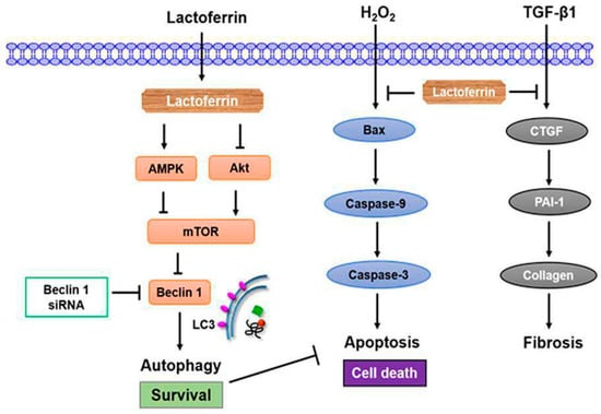 A previous study found that lactoferrin induces autophagy via low-density lipoprotein receptor-related protein 1 and AMP-activated protein kinase activation [36]. Autophagy enhances cell survival and maintains cellular and tissue homeostasis [37]. Current evidence suggests that abnormal autophagy has been implicated in many human diseases, including various kidney diseases (diabetic nephropathies, AKI, polycystic kidney diseases and CKD) [38,39,40]. Autophagy dysfunction can cause a loss of podocytes, glomerulosclerosis and damage to proximal tubular cells. Autophagy also restrained apoptosis of mesangial cells in diabetic nephropathy, through the inhibition of the TGF-1 and PI3K/Akt pathways [41]. In addition, the LC3B knockout mice showed autophagy deficiency and had severe tubulointerstitial fibrosis after ureter obstruction [42]. Therefore, the protective mechanisms of autophagy help repair and regenerate damaged kidneys [40]. In our current study, lactoferrin induced autophagy via the activation of AMPK and the inhibition of the Akt/mTOR pathway in HK-2 cells (Figure 2). The folic acid mouse model showed that the kidney sections of lactoferrin-treated mice markedly increased autophagy (Figure 7C). The knockdown of autophagy significantly accelerated H2O2-induced cell death (Figure 3C). These results suggest that lactoferrin inhibits oxidative stress-induced cell death and apoptosis by augmenting autophagy.