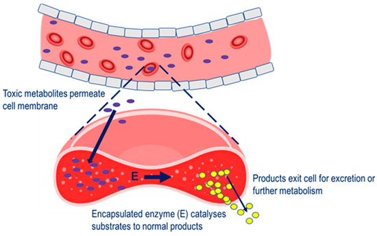 Strategy for the removal of pathological metabolites from the circulation. Pathological metabolites in the blood enter the erythrocyte carrier, to undergo metabolism by the encapsulated enzyme (E).