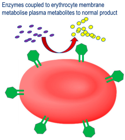 Therapeutic strategy for therapeutic enzymes coupled to the erythrocyte membrane. Pathological plasma metabolites are catalyzed by the conjugated enzyme to their corresponding non-pathological product.