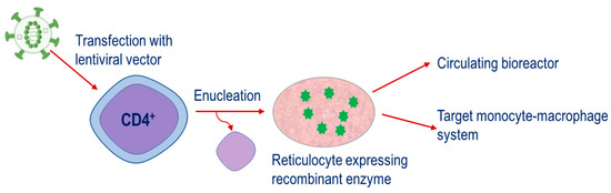 The fourth strategy is a relatively new approach. This is based on the engineering of CD34+ hematopoietic precursor cells to express therapeutic enzymes and then their subsequent differentiation until the nucleus is ejected, resulting in the mature reticulocyte, Figure 4. This strategy has potential applications for both the metabolism of plasma metabolites and targeting of the monocyte–macrophage system.