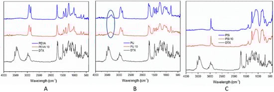 (A) Photoacoustic Fourier-transform infrared (PA-FTIR) spectra of docetaxel (DTX), blank PEVA film (PEVA) and DTX-loaded PEVA film (10% w/w; PEVA10). (B) PA-FTIR spectra of DTX, blank polyurethane (PU) film (PU) and DTX-loaded PU film (10% w/w; PU10); circled region highlighting differences because of possible drug-polymer hydrogen-bonding interactions. (C) PA-FTIR spectra of DTX, blank silicone film (PSi) and DTX-loaded PSi film (10% w/w; PSi10).