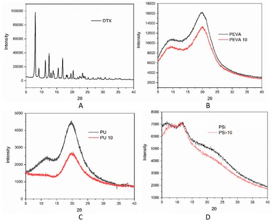 X-ray diffractograms of (A) DTX powder, (B) blank PEVA (PEVA) and 10% w/w DTX-loaded PEVA film, PEVA10 (red), (C) blank PU(Black) and 10% w/w DTX-loaded PU film, PU10 (red), and (D) blank PSi (black) and 10% w/w DTX-loaded PSi film, PSi10 (red).