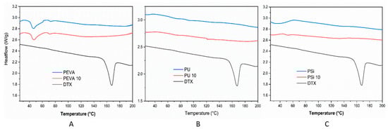 Differential scanning calorimetry (DSC) thermograms of (A) DTX, blank PEVA (PEVA) and 10% w/w DTX-loaded PEVA film (PEVA10), (B) DTX, blank PU (PU) and 10% w/w DTX-loaded PU film (PU10), and (C) DTX, blank Psi (PSi) and 10% w/w DTX-loaded PSi film (PSi10).