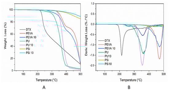 (A) Thermogravimetric analysis (TGA) thermograms and (B) derivative thermogravimetric (DTG) curves of DTX, PEVA, PU, Psi and 10% w/w DTX-loaded PEVA10, PU10, Psi10 films.