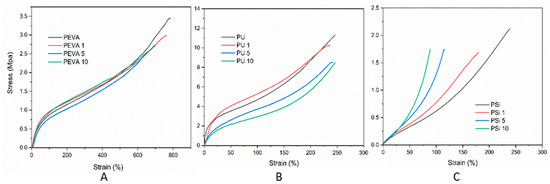 Stress–strain curves of blank, 1, 5 and 10% w/w DTX-loaded polymer films: (A) PEVA, PEVA1, PEVA5 and PEVA10, (B) PU, PU1, PU5 and PU10 and (C) PSi, PSi1, PSi5 and PSi10.