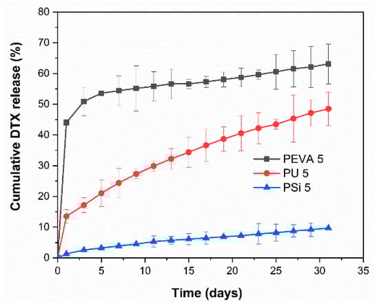 In vitro DTX release profiles from the PEVA5, PU5 and PSi5 films over 31 days in phosphate buffer at pH 6.5 containing 0.1% v/v Tween 80.