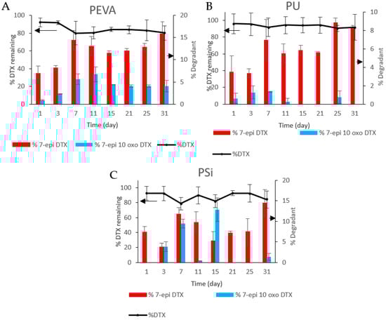 Percentage DTX remaining and percentage release of 7-epi-DTX and 7-epi-10-oxo DTX from (A) PEVA5, (B) PU5 and (C) PSi5 films at selected time points. DTX + 7-epi-DTX + 7-epi-10-oxo-DTX = 100%.