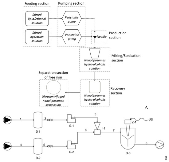 (A) Process schematization of nanoliposomes production through the simil-microfluidic apparatus; the main sections are reported: feeding, pumping, production, mixing/sonication, recovery, separation of free iron. (B) Piping representation for the experimental setup for the simil-microfluidic method: (1–2–3) lipids/ethanol feed line; (4–5–6) water feed line; (D-1 and D-2) feed tanks; (G-1 and G-2) peristaltic pumps; (I-1) injector (production section); (7–8) water/ethanol nanoliposomes suspension; (D-3) recovering/homogenizing tank (from Bochicchio, Dalmoro, Bertoncin, Lamberti, Moustafine and Barba [38] published by the Royal Society of Chemistry).
