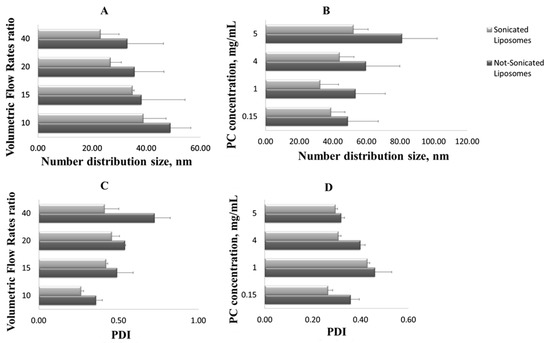 Sonicated and not sonicated liposomes number distribution size (the mean of the number size distribution) at different volumetric flow rate ratios (A) and L-α-Phosphatidylcholine (PC) concentrations (B). Sonicated and not sonicated liposomes polydispersity index (PDI) at different volumetric flow rate ratios (C) and PC concentrations (D). Results are expressed as average of three determinations and reported along with the standard deviation.
