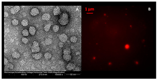 In order to obtain information about morphology, transmission electron microscopy (TEM) (Figure 4A) and fluorescence imaging (Figure 4B) were used. As showed in Figure 4, spherical and separated liposomes were achieved with all the formulations tested.