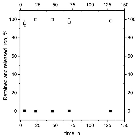 The stability of nanoliposomes containing ferrous sulfate were tested in conditions simulating those of food/beverage storage. In particular, the samples were maintained at 4 °C for a period of about six days in deionized water (pH 6), and the mass of iron present in the supernatant and in the pellet was quantified at established times. Briefly, given amounts of loaded nanoliposomes were put in measured volumes of deionized water. Subsequently, after 6 h, 22 h, 46 h, 70 h, and 130 h, sample aliquots were taken, centrifuged, and treated under the same operating conditions described for the encapsulation efficiency determination. All the measurements were performed in triplicate.