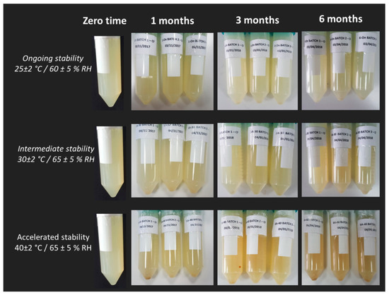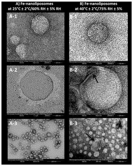 Ongoing, intermediate, and accelerated stability were tested as recommended by the International Conference on Harmonization (ICH) guidelines [34]. In particular, three different batches of ferrous sulfate loaded nanoliposomes were produced, without the use of any stabilizing additives, and stored for six months at environmental conditions 25 °C ± 2 °C/60% RH ± 5% RH (ongoing stability, e.g., stability observed at room conditions at real time); at 30 °C ± 2 °C/65% RH ± 5% RH (intermediate stability, e.g., stability observed at stressed conditions); and at 40 °C ± 2 °C/75% RH ± 5% (accelerated stability, e.g., stability observed at more stressed conditions) under thermostat conditions, in the absence of light. Samples were taken at specific time points (0, 1, 3, and 6 months); observed for their visual aspect by taking photographs; and tested for particles number distribution size, PDI, Z-average, zeta-potential, ferrous sulfate encapsulation efficiency (using the same operating conditions described in Section 2.3), and sample volume variation, by weighing the samples after 1, 3, and 6 months and noting the difference with the sample weight at zero time.