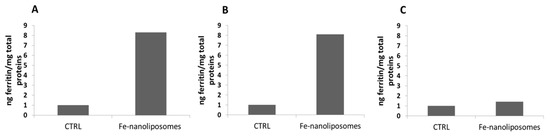 Caco-2 cell iron absorption from nanoliposomes-ferrous sulfate complexes: (A) intracellular ferritin levels of not treated cells (CTRL) and after Fe-nanoliposomes treatment; (B) intracellular ferritin levels of not treated cells (CTRL) and after the uptake of Fe-nanoliposomes stored for two months at 4 °C; (C) Extracellular ferritin levels of not treated cells (CTRL) and after the uptake of Fe-nanoliposomes stored for two months at 4 °C.