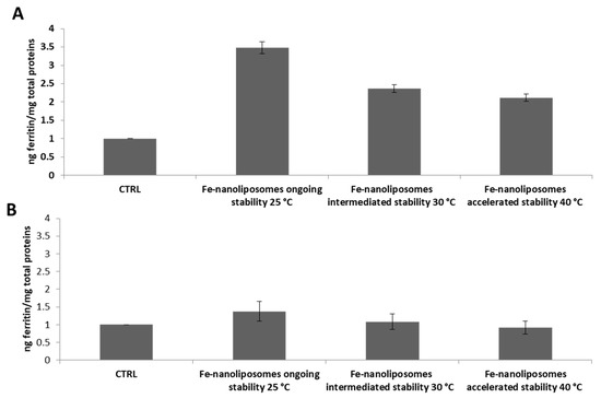The bioavailability of nanoliposomes–iron complexes was also studied for the samples tested for ongoing, intermediate, and accelerated stability showing an excellent ability of the liposomal structures to keep the ferrous sulfate intact while continuing to guarantee its bioavailability. Therefore, intracellular and extracellular ferritin was determined for cells treated with the sample maintained at 25 ± 2 °C/60 ± 5% RH at environment condition and those stored at 30 ± 2 °C/65 ± 5% RH and at 40 ± 2 °C/65 ± 5% RH at thermostated conditions for six months. As shown in Figure 10A, cells treated with the complexes maintained at 25 ± 2 °C/60 ± 5% RH express 3.4 times more ferritin compared to the not treated cells and those treated with complexes maintained at 30 ± 2 °C/65 ± 5% RH and at 40 ± 2 °C/65 ± 5% RH synthesize 2.3 and two times more ferritin, respectively, compared to the control sample, showing not only the liposomal stability but also the chemical integrity of the contained ferrous sulfate. Finally, the levels of extracellular ferritin 24 h after the treatment with nanoliposomes containing iron tested for stability were approximately equal to those of the not treated cells showing again the good iron absorption by Caco-2 cells (Figure 10B).