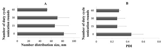(A) Liposomes number distribution size (the mean of the number size distribution) after different number of duty cycle sonication rounds; (B) Polydispersity Index (PDI) of liposomes after different number of duty cycle sonication rounds. Results are expressed as average of three determinations and reported along with the standard deviation.