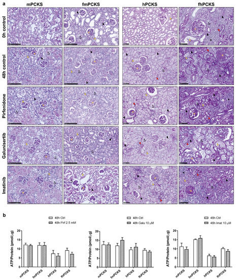 Viability of murine and human PCKS prepared from normal and fibrotic kidneys. PCKS were prepared using Krumdieck tissue slicer and incubated for 48 h with or without compounds—2.5 mM pirfenidone, 10 µM galunisertib, or 10 µM imatinib. Renal tissue viability was assessed histomorphologically using Periodic acid–Schiff (PAS) staining (a) and by measuring ATP levels normalized for total protein content at 48 h with and without treatment (b). Symbols in (a) mark the pathological changes observed in PCKS, such as anucleosis (yellow arrow head), disappearance of the tubular brush border (open black arrow head), thickening of tubular basement membrane (red arrow head), interstitial fibrosis/expansion of interstitial ECM (black arrow head), interstitial inflammation (black star), and glomerular sclerosis of various degree (yellow star). Data in (b) are expressed as mean ± SEM, n = 3–5 (murine PCKS) or n = 5–7 (human PCKS). An unpaired two-tailed Student’s t-test was used to test the differences between 48-h Ctrl and 48-h treatment groups; * p < 0.05; scale bars are 100 µm. Annotations: mPCKS, murine (healthy control) precision-cut kidney slices; fmPCKS, fibrotic murine slices prepared from obstructed for seven days (7dUUO) kidneys; hPCKS, human (healthy control) kidney slices; fhPCKS, fibrotic human slices prepared from patient diseased renal tissues.