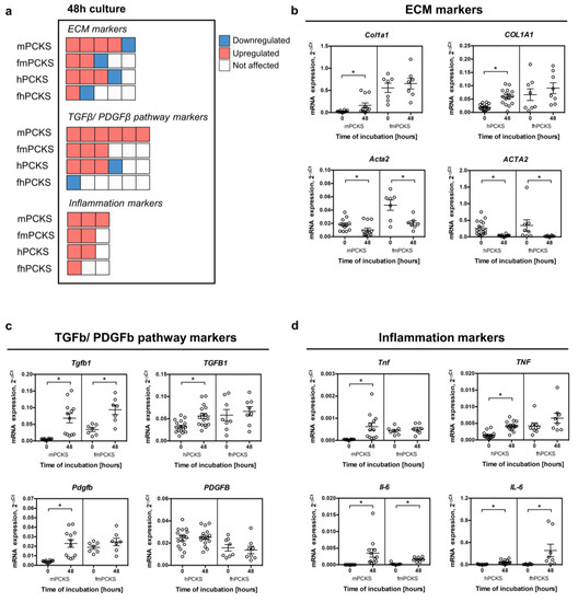 The observed culture-induced effects suggest that murine PCKS develop responses to injury more quickly than human PCKS, as more genes (out of the 14 analyzed genes) were affected by culture of mPCKS at 48 h. Furthermore, PCKS prepared from healthy kidneys (mPCKS and hPCKS) displayed more culture-induced changes in gene expression than PCKS prepared from fibrotic tissues (fmPCKS and fhPCKS). Taken together, 48-h incubation affected all PCKS by inducing and maintaining a fibrogenic and inflammatory environment, making PCKS suitable for studying anti-fibrotic and anti-inflammatory effects of pharmacological interventions.