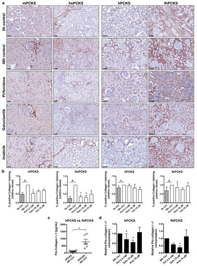 Next, we investigated the changes in protein expression of collagen type I and alpha-smooth muscle actin (α-SMA), in order to assess the ability of the compounds to modulate ECM deposition. Culture for 48 h resulted in a significant increase in accumulation of interstitial type I collagen in mPCKS (p = 0.002), fmPCKS (p = 0.029), and fhPCKS (p = 0.048), but not in hPCKS (p = 0.114) (Figure 4a). Immunohistochemistry and morphometric analysis showed that the tested compounds only affected protein expression of collagen type I in murine PCKS (Figure 4a,b). In particular, pirfenidone significantly reduced collagen type I deposition in mPCKS by 48% (p = 0.004) and in fmPCKS by 66% (p = 0.028). Treatment with 10 µM galunisertib resulted in 34% decrease in collagen type I levels in mPCKS (p = 0.077) and 68% decrease in fmPCKS (p = 0.022). Of note, lower concentrations of galunisertib showed no effect on ECM deposition in mPCKS (Figure S7a,b). Imatinib (10 µM) also affected interstitial accumulation of collagen type I in murine PCKS, although not significantly, showing 31% reduction in mPCKS (p = 0.170) and 51% reduction in fmPCKS (p = 0.312).