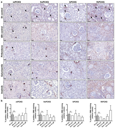Figure 5 illustrates the protein expression of α-SMA in murine and human PCKS. Despite the consistently reduced ACTA2 transcription in PCKS during culture, this effect did not translate to the protein level, as cortico-interstitial expression of α-SMA did not significantly change at 48 h compared to 0 h (Figure 5a,b). Neither of the tested compounds significantly affected protein levels of α-SMA in PCKS after 48 h treatment (Figure 5a,b). Figure S8 shows effects of all tested concentrations of galunisertib and imatinib on α-SMA expression: the only significant change in α-SMA levels was observed in hPCKS upon treatment with imatinib at 5 µM, but not at 10 or 25 µM.