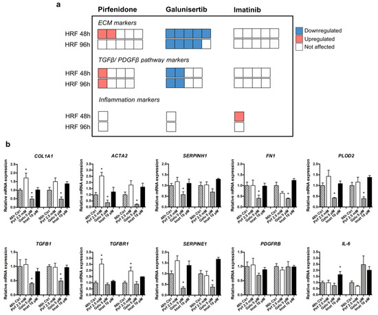 Potency of tested anti-fibrotic compounds to attenuate TGFβ- and PVP40-induced gene expression of fibrosis and inflammation markers in human renal fibroblasts (HRFs). (a) Visual summary of changes in the transcription of selected genes in HRFs after 48 h treatment with pirfenidone 2.5 mM, galunisertib 5 µM, or imatinib 10 µM. Each box represents one gene, while the direction of change is indicated by the color: red, upregulated during 48-h culture; blue, downregulated; and white, not affected by the compound. This diagram only indicates the number of altered genes (without specifying marker genes) and the direction of change, in the following order: downregulation, upregulation, and no change. Evaluated genes were divided in three categories: extracellular matrix (ECM) markers (COL1A1, ACTA2, SERPINH1, FN1, and PLOD2), markers of TGFβ and PDGF signaling (TGFB, TGFBR1, SERPINE1, and PDGFRB), and inflammation marker IL-6. (b) Regulation of abovementioned markers in treated HRFs in detail. Regulation of these transcripts by pirfenidone, galunisertib, and imatinib at lower concentrations is illustrated in Figure S9b. Data are expressed as mean ± SEM, n = 3; * p < 0.05.