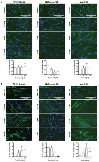 Effect of pirfenidone, galunisertib, and imatinib on extracellular deposition of collagen type I in human renal fibroblasts (HRFs). HRFs were stimulated with macromolecular crowder PVP-40 and TGFβ, and cultured in the presence of pirfenidone (0.5, 1, and 2.5 mM), galunisertib (0.1, 1, and 5 µM), or imatinib (1, 5, and 10 µM) for 48 and 96 h. Representative photomicrographs of immunocytochemistry for extracellular collagen type I fibrils (green) in HRFs treated with compounds for 48 h (a) and 96 h (b), with respective computerized quantitative analyses. Nuclei (blue); scale bars are 100 µm. Data are expressed as mean ± SEM, n = 3; * p < 0.05.