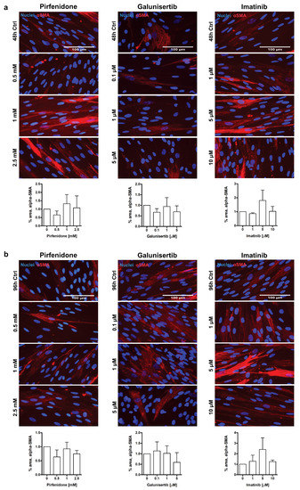 Effect of pirfenidone, galunisertib, and imatinib on accumulation of alpha-smooth muscle actin (α-SMA) in human renal fibroblasts (HRFs). HRFs were stimulated with macromolecular crowder PVP-40 and TGFβ, and cultured in the presence of pirfenidone (0.5, 1, and 2.5 mM), galunisertib (0.1, 1, and 5 µM), or imatinib (1, 5, and 10 µM) for 48 and 96 h. Representative photomicrographs of immunocytochemistry for α-SMA (red) in HRFs treated with compounds for 48 h (a) and 96 h (b), with respective computerized quantitative analyses. Nuclei (blue); scale bars are 100 µm. Data are expressed as mean ± SEM, n = 3; * p < 0.05.