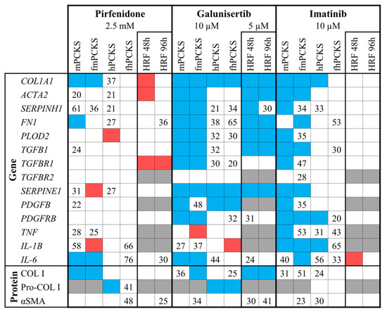 Summary of the observed anti-fibrotic effects of pirfenidone, galunisertib, and imatinib in precision-cut kidney slices (PCKS) and human renal fibroblasts (HRFs). Blue color indicates a significant inhibition, red color shows significant increase, and markers that were not tested in any particular condition are colored in grey. Numbers represent mean percent reduction in gene or protein expression that did not reach statistical significance (only reduction ≥20% is taken into account). Concentration-dependent effects of tested compounds are illustrated in Figure S6 (PCKS) and Figure S9 (HRFs). Annotations: mPCKS, murine (healthy control) precision-cut kidney slices; fmPCKS, fibrotic murine slices prepared from obstructed for seven days (7dUUO) kidneys; hPCKS, human (healthy control) kidney slices; fhPCKS, fibrotic human slices prepared from patient diseased renal tissues.