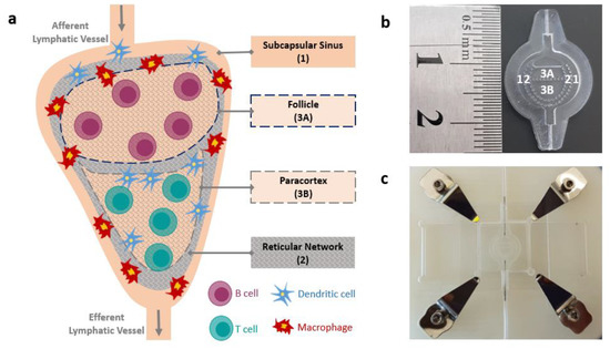 Studies on cellular systems should be performed using experimental setups that closely mimic the native microenvironment in which the cells can perform a physiological-like function. Such setups are made possible by the microfluidic technology, which is widely employed in biological research, as it allows miniaturization of components, efficient consumption of reagents, maximal output from precious samples, and high-throughput analysis of cellular behavior and dynamics in their microenvironment [12,13,14]. Harnessing of the microfluidic technology has resulted in many cellular and tissue systems being mimicked and miniaturized in research labs and in more established models now being commercially available [15,16,17,18]. However, in spite of the large number of models proposed for drug development applications, including those of the skin, liver, and gut, the recreation of the complex architecture of the lymph node (LN) has not been provided yet [13,19]. Only recently has the need for developing an LN-on-a-chip been recognized, as the immune outcome from LN is a key determinant of not only the immunotoxicity of drugs, but also the response to viruses, bacteria, and other foreign particles [20].