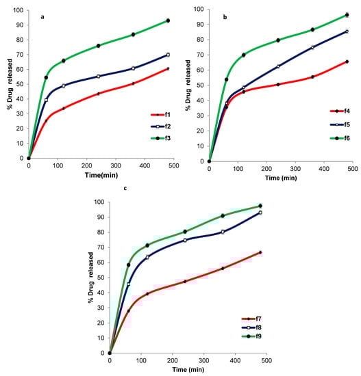 To determine the release kinetics and drug-release mechanism from ACZ-loaded TNVs, the drug-release data were treated by using different mathematical models, including zero-order kinetics, first-order kinetics, the Higuchi model, the Hixson–Crowell equation, and the Korsmeyer–Pappas model. The model with the highest coefficient of determination (R2) was chosen [30].