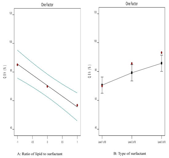 According to the initial prescreening trials, the ratio of lipid to surfactant (X1) and type of surfactant (X2) were chosen as the critical formulation parameters for preparation of the target product with acceptable formulation characteristics and entrapment efficiency. ACZ-loaded TNVs were prepared according to a three-level (32) factorial design, using Design-Expert software, Version 12 (Stat-Ease Inc., Minneapolis, MN, USA), to investigate the joint effect of formulation variables on the vesicle characteristics. In this design, the ratio of lipid to surfactant (X1) and type of surfactant (X2) were selected as independent variables, whereas the percentage of drug released after 8 h (Q8h, Y1) and entrapment efficiency (EE%, Y2) were chosen as dependent variables (Table 3) [21]. Each factor was screened at three levels (−1, 0 and +1) that labeled the lower level, the middle level, and the upper level, respectively.