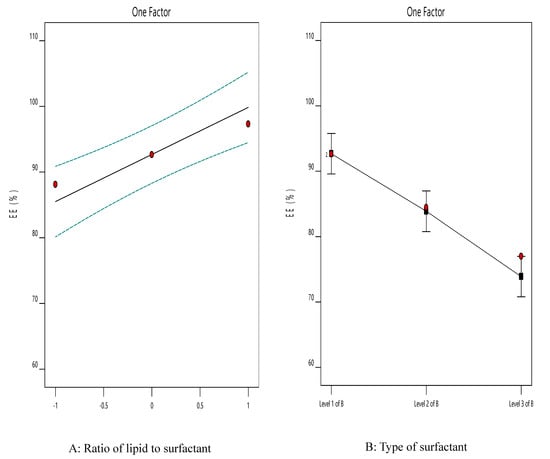 The preliminary screening study was conducted to select the levels of the factors considered for the experimental design on the basis of entrapment efficiency. With respect to the type of phospholipid, ACZ-loaded TNVs produced using soybeans PC were found to be more uniform than egg yolk PC. These results are in agreement with Guldiken et al. [69]. In addition, EE% of ACZ-loaded TNVs prepared by soybean PC ranged from 31.51 ± 1.58% to 97.30 ± 1.68, while EE% of ACZ-loaded TNVs prepared by egg yolk PC ranged from 28.61 ± 1.33% to 94.60 ± 1.74%. Although EE% was higher in case of soybean PC, no significant variation (p > 0.05) in EE% was noticed between nanotransfersomal formulations prepared by both types of phospholipids. Therefore, the type of phospholipid was not chosen as an independent variable and soybean PC was selected for the fabrication of ACZ-loaded TNVs.