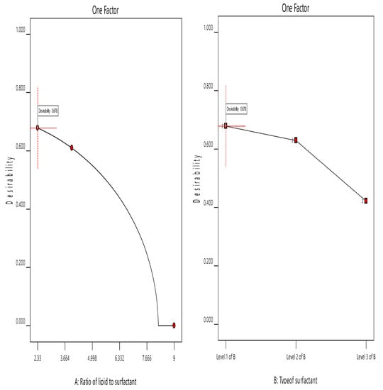 The desirability index was used for choosing the optimized formula. The desirability index investigates the desirable range for each response, and it is a value between 0 and 1. A desirability index of 1 expresses a completely desirable formula, while a desirability index of 0 expresses a completely undesirable formula [22]. In this model, the choice of the optimized formula was based on maximizing both Q8h and EE%.