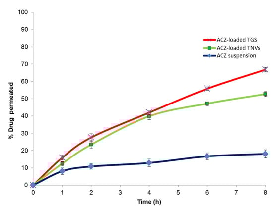 The in vitro release from the ACZ-loaded TGS formulation and ACZ aqueous dispersion through a semi-permeable cellulose membrane was determined by using a modified Franz diffusion cell, as described before. The in vitro profile of ACZ-loaded TGS was compared with the previous results of the corresponding transfersomal formula (F8), to investigate the effect of the addition of poloxamer polymers on the in vitro release profile of ACZ.