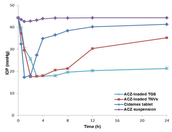 The normal IOP of the tested New Zealand albino rabbits was 20.4 ± 1.9 mmHg. Ocular hypertension was induced by injecting 0.1% dexamethasone phosphate solution into the limbus of the right eye of different groups for 1 week [57,58]. The increase in IOP was monitored by using a Schiotz tonometer (Schiotz tonometer, Riester, Germany). The resting IOP in all animals was measured, using a tonometer, before drug administration. A 0.2% solution of Lidocaine HCI was used as a local anesthetic. Rabbits with high IOP were divided into five groups and treated with a single dose of each formulation (equivalent to 500 µg of ACZ), as previously described in the ocular irritancy test. The IOP was determined at 0.5, 1, 2, 3, 4, 6, 8, 12, and 24 h after drug administration [59]. Each measurement was repeated three times, and the data were expressed as the mean values ± SD.