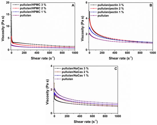 Viscosity as a function of shear rate for the pullulan solution and its blends with increasing concentrations of (A) HPMC, (B) pectin and (C) sodium caseinate.