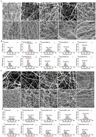 (A) and (C) SEM images of the ODF formulations containing (a) pullulan, (b) pullulan/HPMC 3%, (c) pullulan/HPMC 2%, (d) pullulan/HPMC 1%, (e) pullulan/pectin 3%, (f) pullulan/pectin 2%, (g) pullulan/pectin 1%, (h) pullulan/NaCas 3%, (i) pullulan/NaCas 2%, (j) pullulan/NaCas 1% and (k) pullulan-ISO, (l) pullulan/HPMC 3%-ISO, (m) pullulan/HPMC 2%-ISO, (n) pullulan/HPMC 1%-ISO, (o) pullulan/pectin 3%-ISO, (p) pullulan/pectin 2%-ISO, (q) pullulan/pectin 1%-ISO, (r) pullulan/NaCas 3%-ISO, (s) pullulan/NaCas 2%-ISO and (t) pullulan/NaCas 1%-ISO and their respective diameter distributions (B). (a–j) and (D). (k–t). Scale bar: 10 μm.