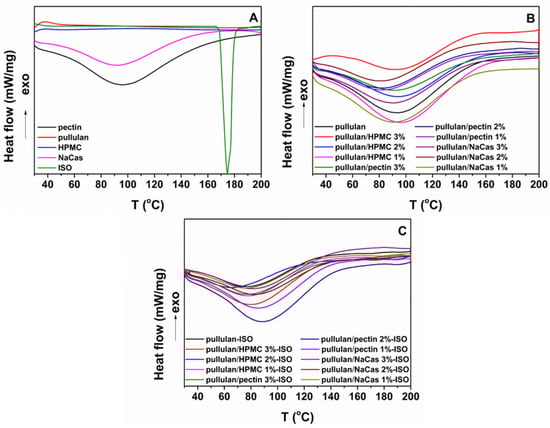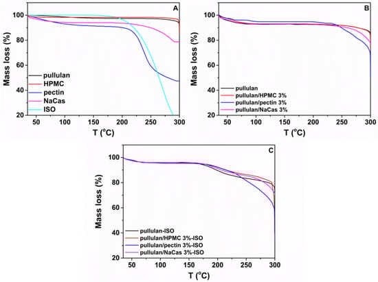 Thermogravimetric analysis was carried out to investigate the thermal stability of the ODFs, and the thermograms of the raw materials and of representative ODFs are presented in Figure 4. All ODF formulations (Figure 4B) demonstrated two main thermal events. The first stage occurred at the temperature range of 40–100 °C and was attributed to the evaporation of the absorbed water, while the second thermal event was observed at temperatures above 250 °C for the pullulan and pullulan/HPMC 3%, attributed to the decomposition of the lower molar mass fractions of pullulan [41] and the cellulose ethers degradation of HPMC [42], respectively, at 232 °C for the pullulan/pectin 3%, associated with the depolymerization of pectin chains [43] and at ca. 170 °C for the pullulan/NaCas 3%, related to the degradation of NaCas [44]. The ISO-loaded ODFs were characterized by three stages of mass loss associated to moisture desorption (first), also showing an earlier onset of thermal decomposition (ca. 170 °C) compared to the plain ODFs, which corresponded to drug decomposition (second), followed by the biopolymers degradation (third). It is noteworthy that results indicated an acceptable thermal stability of the produced ODFs.