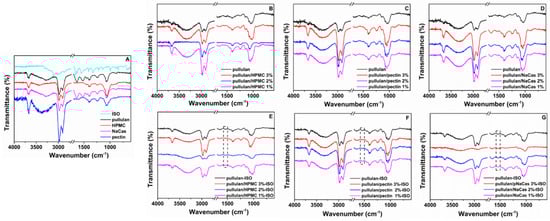 FTIR spectra of the (A) raw materials, the plain ODFs containing (B) HPMC, (C) pectin and (D) NaCas, and the ISO-loaded ODFs containing (E) HPMC, (F) pectin and (G) NaCas.