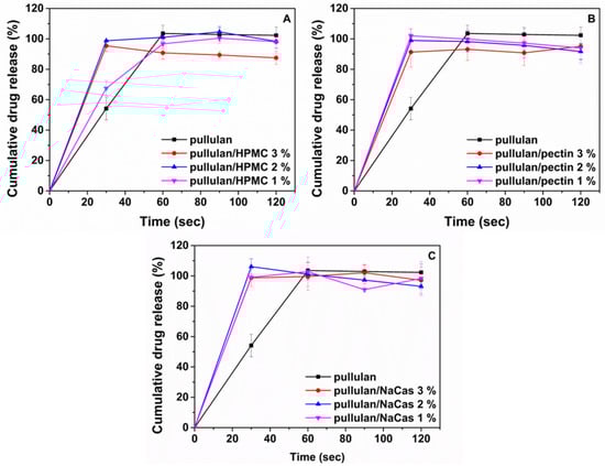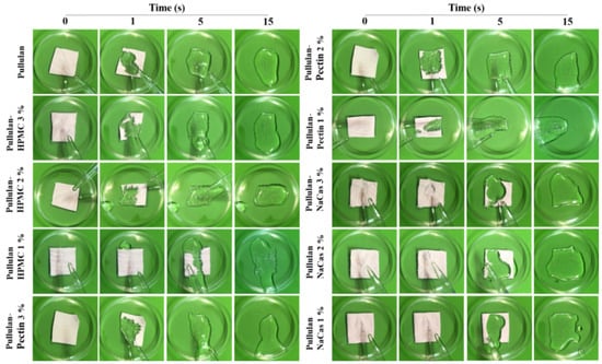 The disintegration profiles of the ODFs were recorded with a camera in SSF using the Petri dish set-up (Figure 6). It is clearly visible that complete disintegration of all ODF formulations occurred within less than 15 s. In particular, the inclusion of HPMC and pectin contributed to the rapid disintegration of the ODFs within 5 s, whereas the NaCas-containing ODFs showed a minor delay in the time required for their complete dissolution to occur compared to the rest of the tested formulations, which however, did not exceed 15 s. Hence, all drug-loaded nanofibers films instantaneously dissolved when brought in contact with the SSF medium, and the end-point of disintegration was approximately estimated to be 15 s. The disintegration time is an important quality attribute of ODFs; therefore, the complete dissolution of the prepared pullulan electrospun films containing HPMC, pectin and NaCas within less than 15 s meets the nonbinding recommendations of the FDA for drug products meant to be administered without chewing or liquids (<30 s) [49]. Representative videos from the disintegration profile of pullulan/HPMC 3% and pullulan/NaCas 3% are shown in Video S1 and S2, respectively.
