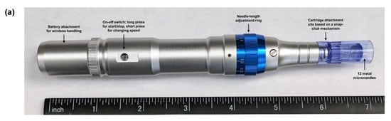 - Arora, S.; Gupta, P.B. Automated microneedling device-a new tool in dermatologist’s kit-a review. J. Pakistan Assoc. Dermatol. 2012, 22. [Google Scholar]