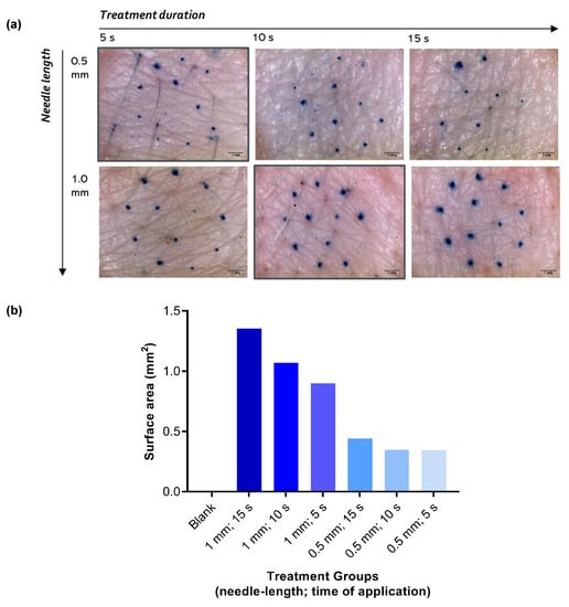 Dye-binding studies enabled the visualization of the hydrophilic pores created by the MN device (Figure 2). Needle lengths lower than 0.5 mm, applied for 5 s, resulted in incomplete microporation (<10 microchannels formed by the 12 needles in a cartridge). Longer than 10 s treatment with 1 mm needle length resulted in excessive diffusion of dye from the pores formed. The surface area of the pores formed ranged from 0.345 mm2 (0.5 mm needle length; 5 s) to 1.354 mm2 (1 mm needle length; 15 s), as compared in Figure 2b.
