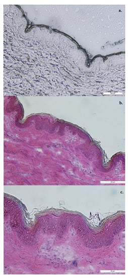 Histological evaluation of (a) the formation of gel in situ in successfully microporated skin (methylene blue solution used to stain the formulation) followed by (b,c) hematoxylin and eosin staining. Scale bar represents (a,b) 100 µm and (c) 50 µm.