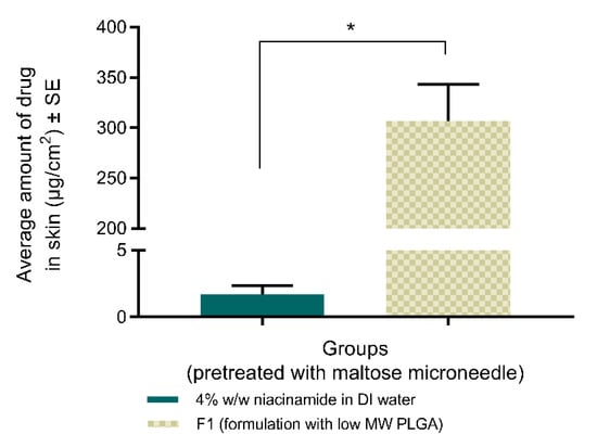 In vitro permeation studies on porcine ear skin, demonstrated the success of the designed formulations on the enhanced topical delivery of niacinamide. Initial studies performed with maltose MNs established proof of concept of in situ gelation within microchannels, in addition to histological evaluation of the in situ gelation as observed in Figure 4. Although a significantly higher amount of drug in skin (307 ± 36 µg/cm2) was seen with F1-formulation, compared to the aqueous solution (1.7 ± 0.6 µg/cm2, Figure 5) on MN-treated skin, the retention of niacinamide in skin was lower with 4% w/w aqueous solution on MN-treated skin, compared to untreated (50 ± 19 µg/cm2). Thus, enhanced topical delivery on the application of F1 on microporated skin was attributed to the application of the in situ gel on microporated skin, and not due to microporation of skin alone. Although microporation of skin by itself did not enhance dermal delivery of niacinamide, it was necessary to facilitate gelation of the PLGA-containing formulations in situ.