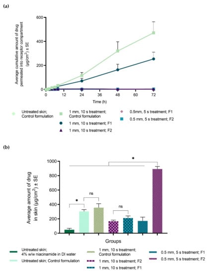 Hence, the effect of different grades of PLGA was reevaluated with 0.5 mm, 5 s treatment and a significantly higher amount was seen in skin with F2 (892 ± 36 µg/cm2) in comparison to F1 (172 ± 53 µg/cm2). As higher molecular weight PLGA, as used in F2, has a higher viscosity, it lowers initial burst release and slows diffusion of solvent and drug from the matrix [,]. Thus, drug loss to the receptor compartment was lower with F2 than with F1, and topical delivery of niacinamide was higher with F2.