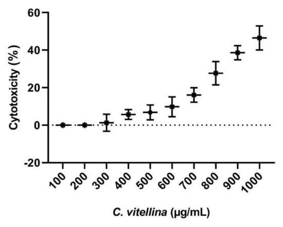 The mononuclear cells of peripheral blood (EDTA-anticoagulated), from three non-smoker and healthy male volunteers, were isolated by density gradient centrifugation method at 1500 rpm for 10 min through the Ficoll-Hypaque (Lonza, Basel, Switzerland). The study was approved by the Ethics Committee at the Faculty of Science, Menoufia University (MUFS-GE-1-20) after obtaining written consent from all participants. Using a trypan blue (0.4%) exclusion technique, the cells’ viability was calculated using a hemocytometer. Samples of less than 95 percent of viable cells and more than 2 percent of red blood cells contamination were excluded. For performing MTT assay, about 2 × 104 of isolated mononuclear cells in complete RPMI (RPMI-1640 medium, 15% FBS and 1% penicillin/streptomycin) supplemented with phytohemagglutinin-L (Sigma-Aldrich, St. Louis, MO, USA) were incubated in a 96-well microtiter plate for 48 h. Thereafter, serial concentrations of C. vitellina were applied in triplicate and the cultures were extended for another 24 h. After the incubation period, MTT (5 mg/mL) was added to each well for 4 h at 37 °C. Then, the resulting formazan crystals were dissolved using 0.04 N HCl in isopropanol and the absorbance was recorded at 570 nm using a microplate reader (RADIM SEAC Sirio S, Rome, Italy).