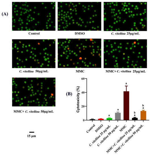 The fluorescent AO/EB double staining was used to evaluate the viability of HPBL. The HPBL staining displayed uniform fluorescent green cells in the control and DMSO-treated groups, whereas apoptotic cells in the early stage were marked by the yellow-green color. Orange nuclei revealed necrotic and late-stage apoptotic cells among treated groups; especially in MMC-treated groups (Figure 2A). The significant (p ≤ 0.05) reduction in toxicity was observed among 25 and 50 µg/mL of C. vitellina extract (3.38 ± 0.76 and 13.23 ± 1.04, respectively) in comparison to MMC (41.67 ± 7.63) records (Figure 2B).